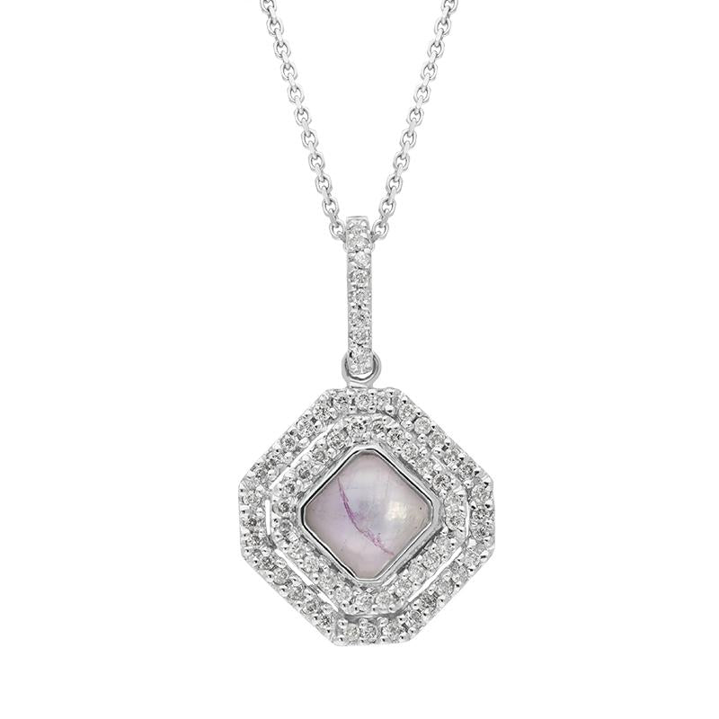 This sophisticated necklace features a stunning square cut Derbyshire Blue John gemstone that has been sourced directly from Castleton, Derbyshire. It is encased in an 18ct white gold double row octogen shaped setting that is set with 0.34cts of fine quality white diamonds which extend up the pendant bail, 65 diamonds in total.