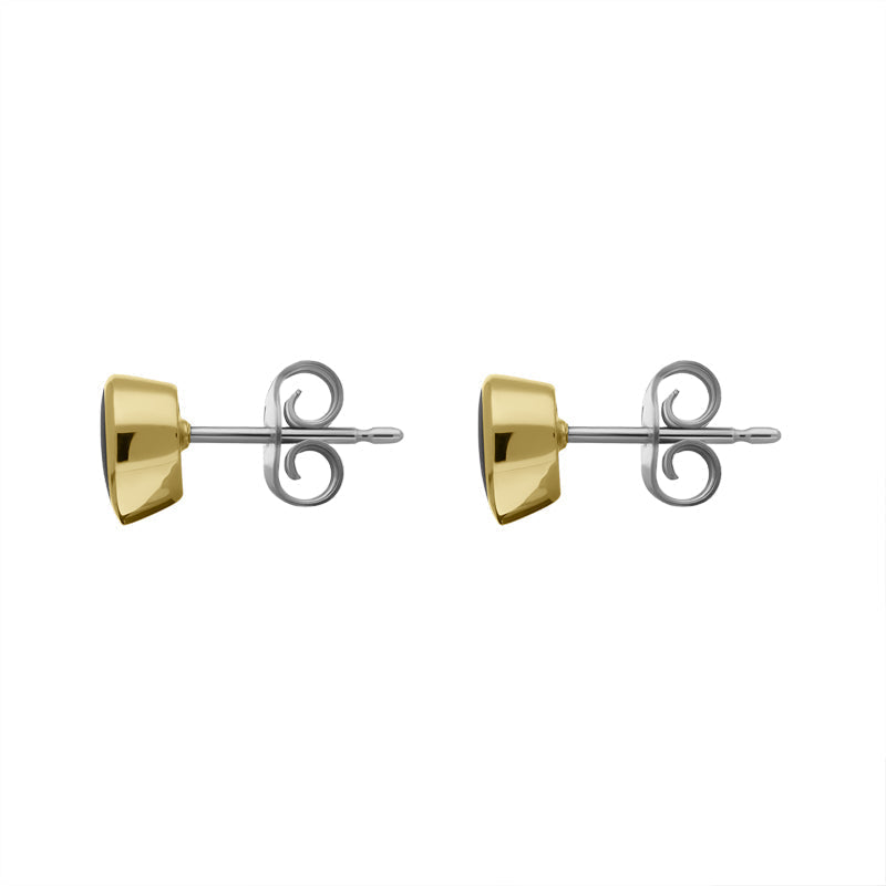 These stud earrings feature highly polished genuine Whitby Jet set in 9ct yellow gold frames with sterling silver post and butterfly fastenings.