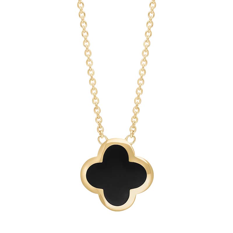 This elegant pendant features a stunning four leaf clover shaped cabochon of the finest Whitby Jet stone, sourced directly from the north east coast of Yorkshire. The clover is surrounded with a polished edge detail for a unique, stylish finish. The striking Whitby Jet forms a stunning contrast between the 9ct yellow gold polished frame, creating the perfect look for every occasion. Presented on an 18 inch long 9ct Yellow gold chain.