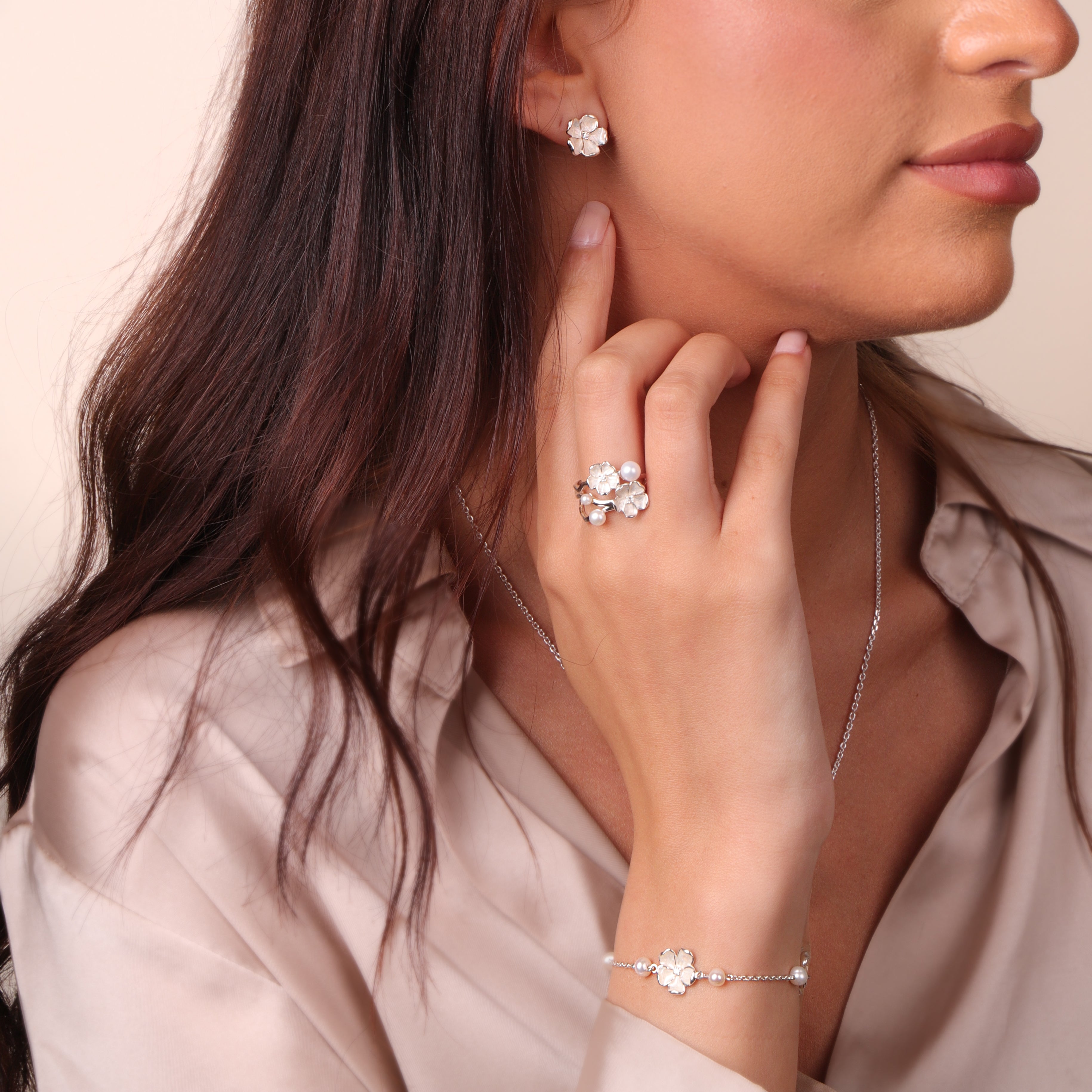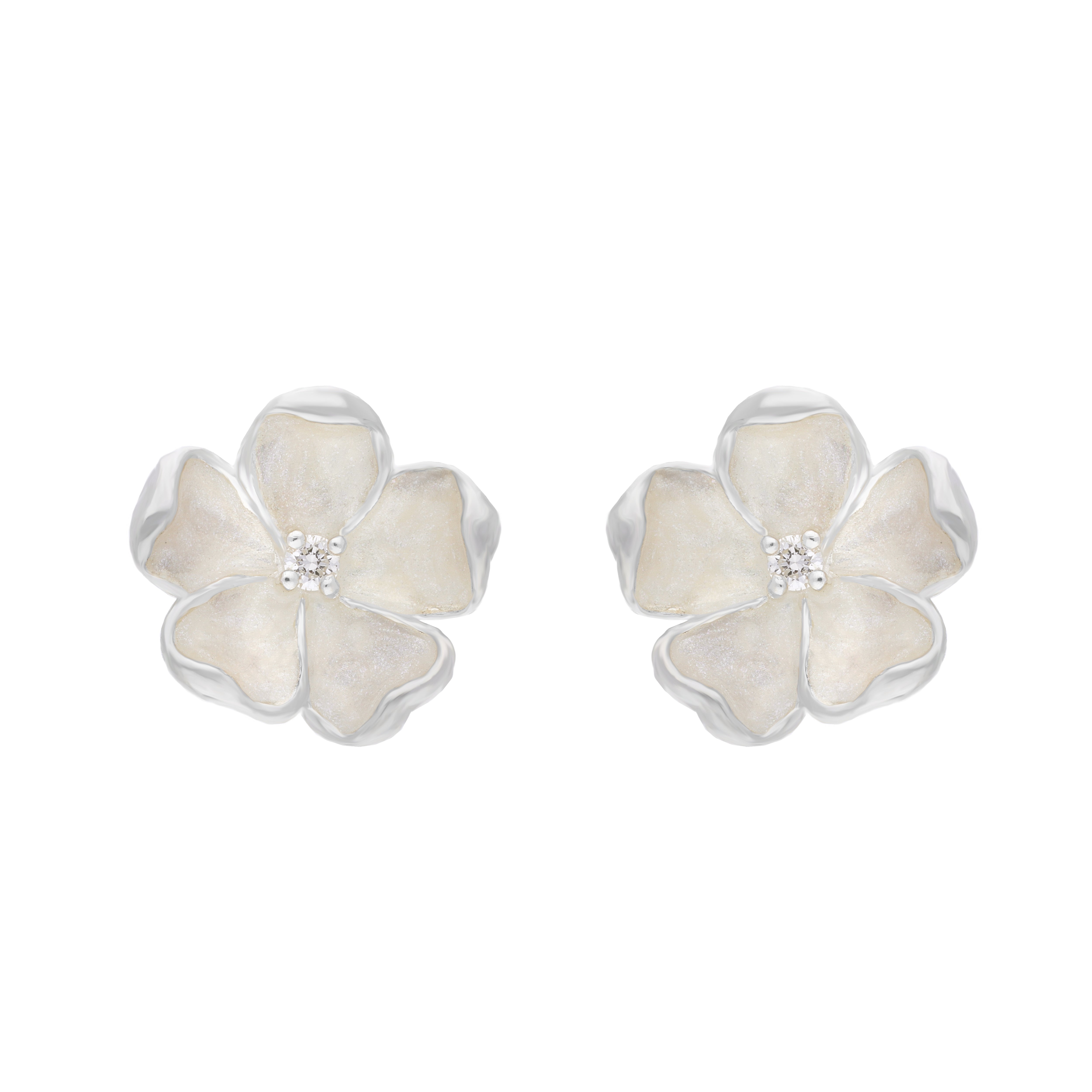 Sterling Silver White Enamel Diamond Flower Studs Earrings