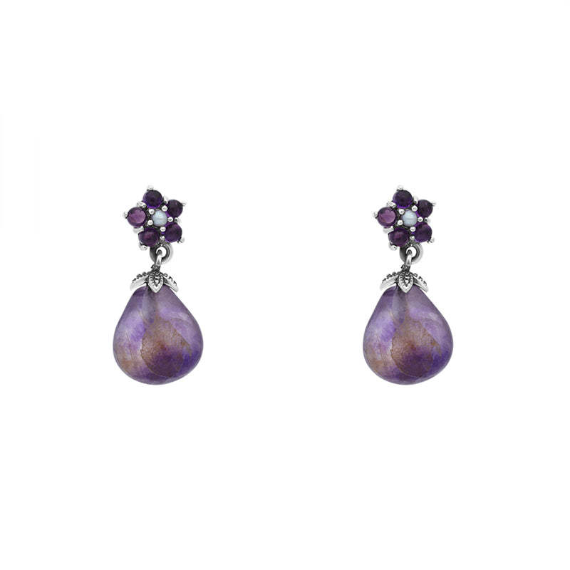These charming earrings features the finest Blue John and Amethyst. The intricate design combines the Blue John and Amethyst with Pearl which creates a stunning contrast between sterling silver and makes the perfect earrings for someone looking for a beautifully unique piece.