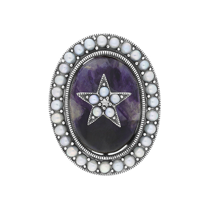 This statement ring features a large oval piece of hand carved Blue John, sourced directly from Castleton, Derbyshire. The stone is placed within an exquisite sterling silver oval setting and surrounded by Pearl gemstones on a sterling silver band. The centre of the ring features a large star detail in subtle yet stunning pearl setting.
