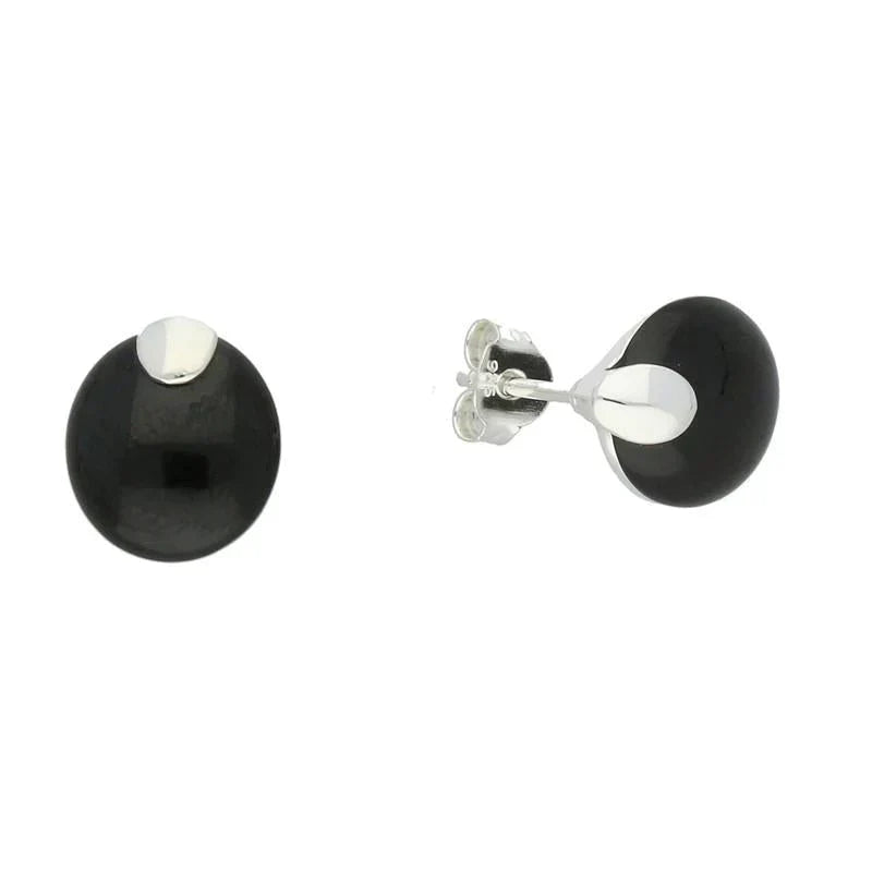 These circular stud earrings are made of finest hand carved Whitby Jet with a Sterling Silver button cap design, contrasting against the gemstone. The stud earrings are simple yet elegant, looking beautiful with any outfit.