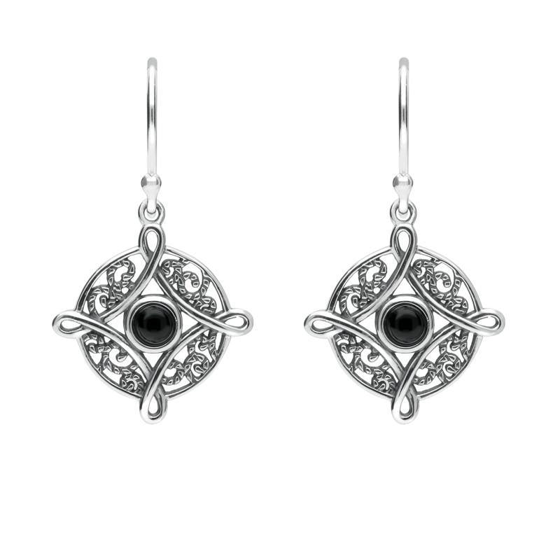 These exquisite earrings feature two stunning circular shaped cabochons of the finest Whitby Jet stone, sourced directly from the north east coast of Yorkshire. The stones are framed by a sterling silver Celtic-style cross and a delicate filigree rope design for an exquisite finish. The ornate sterling silver earrings are perfect for everyday wear and are easily secured with hook fastenings.
