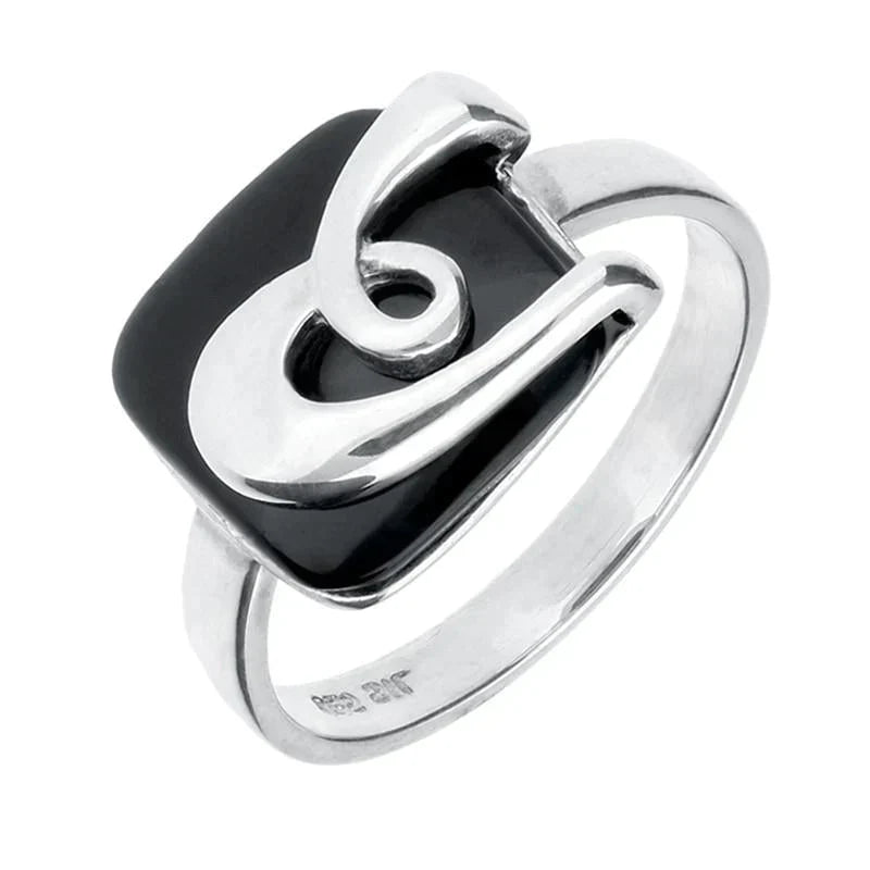This eye-catching ring features a stunning cushion shaped cabochon of the finest Whitby Jet stone, sourced directly from the north east coast of Yorkshire. The striking sterling silver swirl frame is a contemporary, unique feature enhancing the Jet stone beautifully.