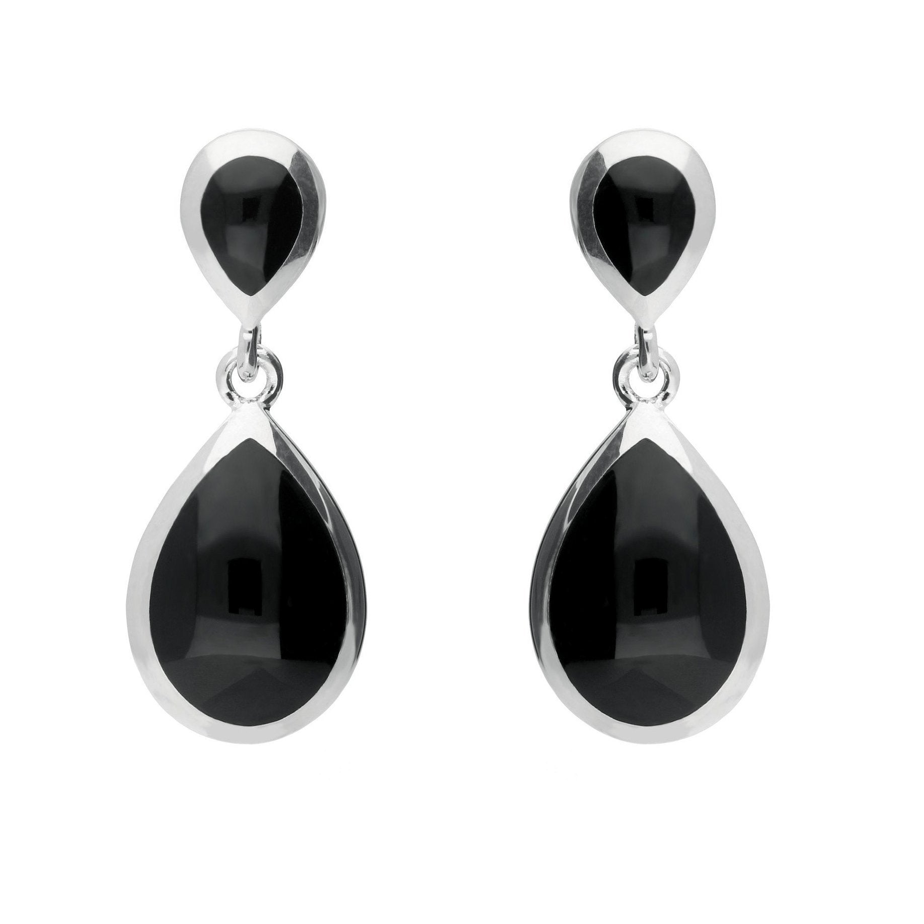 A perfect gift for a loved one, this beautiful sterling silver and Whitby Jet two piece set features two hand carved  pear shaped Whitby Jet gemstones set within an elegant double drop of sterling silver. Comprising of a pair of drop earrings and necklace, complete with an 18 inch sterling silver chain. All items can be sold separately.