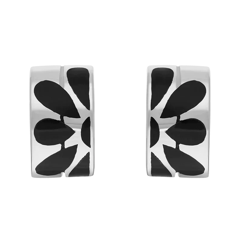 Sterling Silver Whitby Jet Flower Inlaid Wavy Open Hoop Stud Earrings D