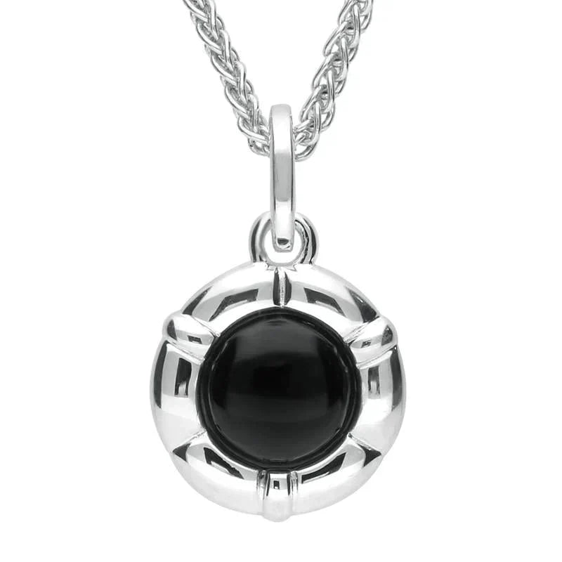 This unique round shaped necklace features a hand carved Whitby Jet stone that has been sourced directly from the North East Coast of Yorkshire. The individual highly polished Whitby Jet has been framed within sterling silver with intricate ridged detailing which sits gracefully on an 18 inch sterling silver chain and would be a beautiful addition to any jewellery lovers collection.