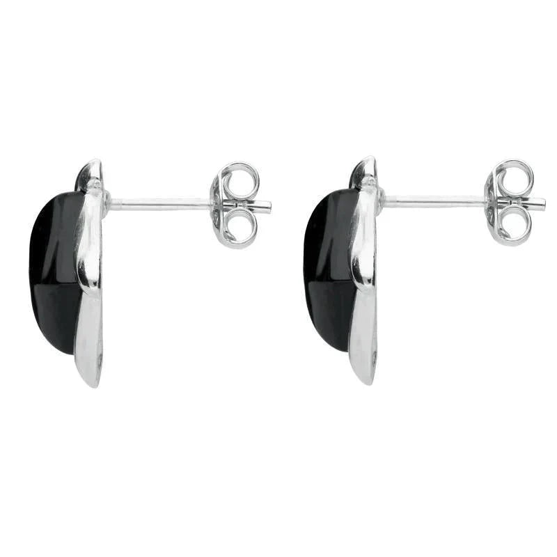 These classic earrings feature highly polished Whitby Jet gemstones surrounded by unusual ridges of Sterling Silver. Set with secure post and butterfly fittings for an everyday wear, the earrings complement any outfit.