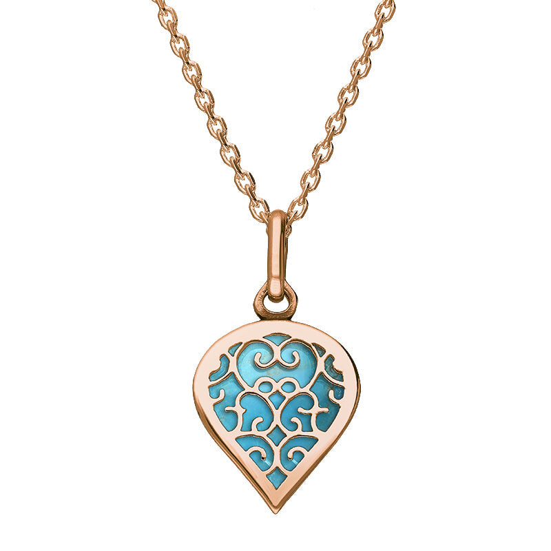 18ct Rose Gold Turquoise Flore Filigree Small Heart Necklace. P3629.