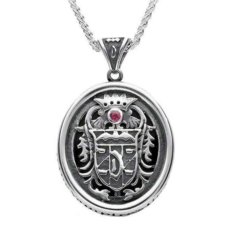 This stunning 9ct white gold pendant encloses an oval Whitby Jet gemstone and 'Blood Red' Ruby beneath the family crest, held within an oval frame which is engraved with an extract from the original 'Dracula' novel by Bram Stoker. Supplied complete with an 18 inch 9ct white gold chain.