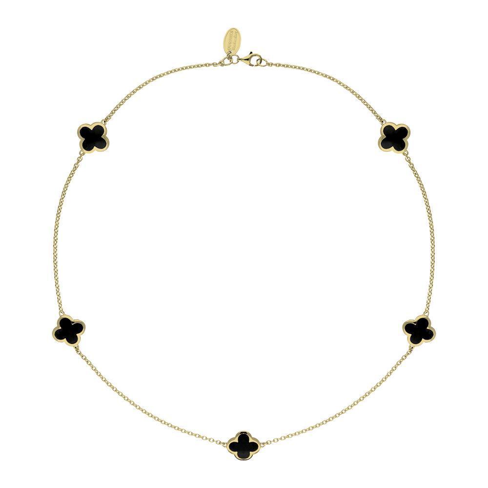 This elegant necklace features five stunning four leaf clover shaped cabochons of the finest Whitby Jet stone, sourced directly from the north east coast of Yorkshire. The striking Whitby Jet forms a stunning contrast between the 9ct Yellow Gold chain, creating the perfect look for every occasion.
