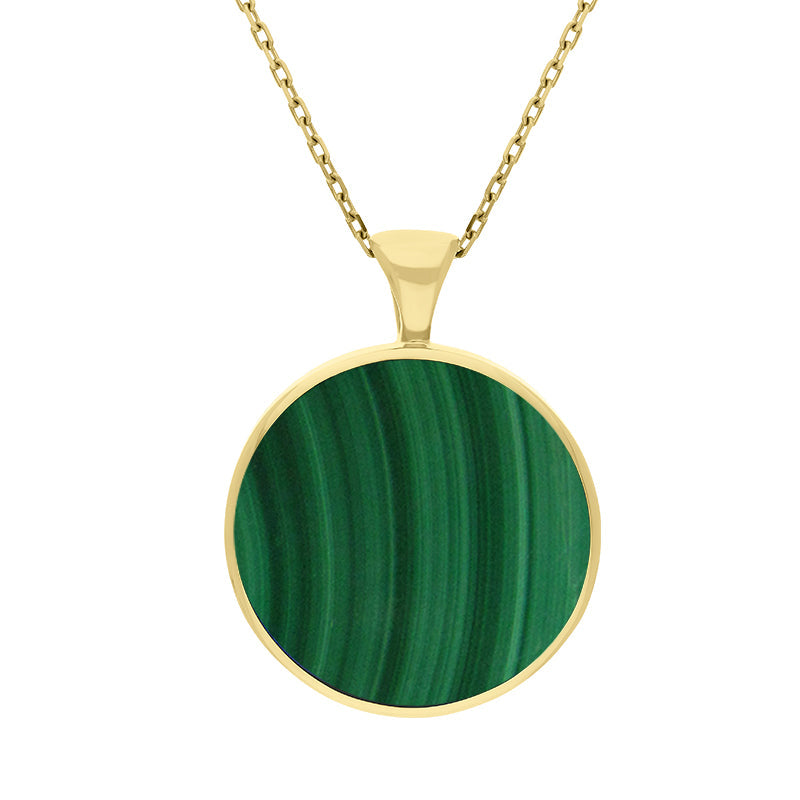 9ct Yellow Gold Whitby Jet Malachite Large Double Sided Round Fob Necklace, P012.