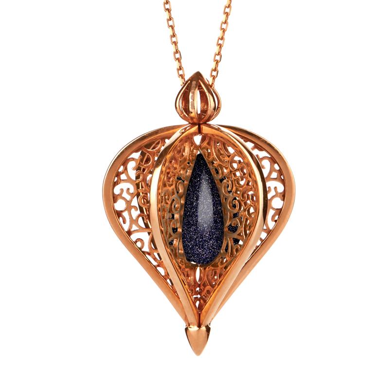 9ct Rose Gold Blue Goldstone Flore Filigree Droplet Necklace, P2330C.