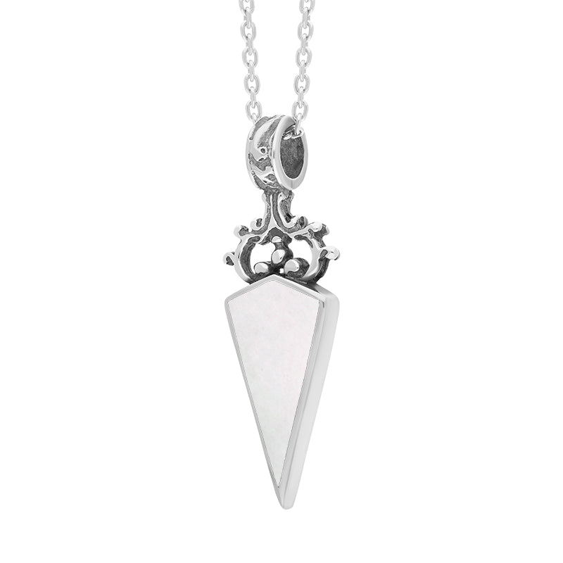 9ct White Gold Blue John White Mother Of Pearl Double Sided Scroll Top Dagger Fob Necklace, P423.