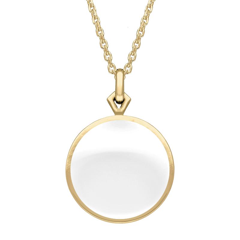 This beautiful necklace is part of Rebecca Sellors' Flore collection. The pendant is double-sided, and features a hand carved and polished cabochon of fine white Bauxite. The gemstone is set in an intricately crafted 9ct yellow Gold filigree design. Sold complete with an 18 inch 9ct yellow Gold chain which fastens with a classic bolt ring style clasp.