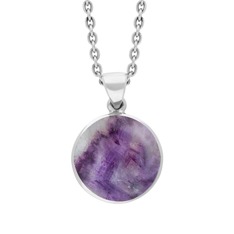 The circular highly polished Blue John gemstone in this simple pendant is surrounded by a slim frame of sterling silver. Presented on an 18 inch long sterling silver chain.