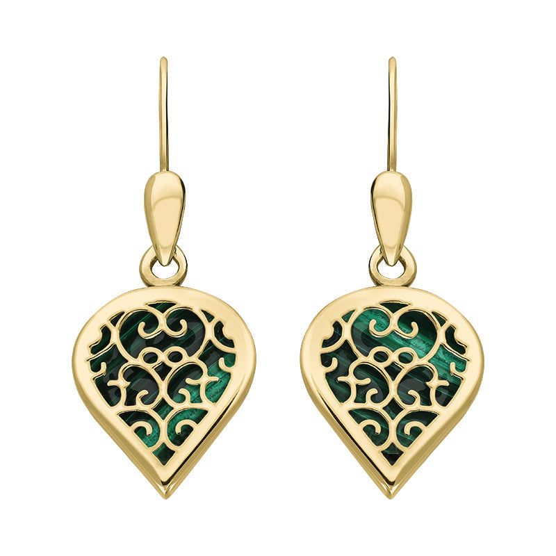 9ct Yellow Gold Malachite Flore Filigree Heart Drop Earrings. E2588.