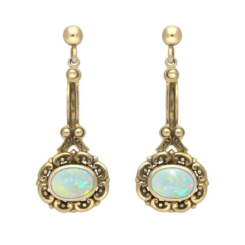 9ct Yellow Gold Opal Ornate Antique Oval Drop Earrings