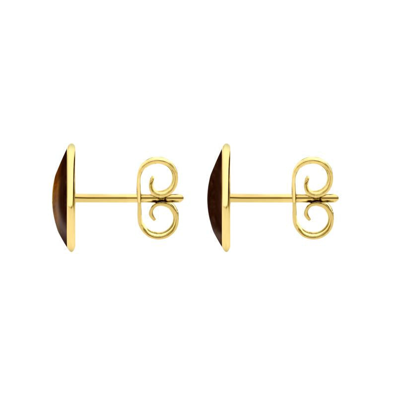 These classic stud earrings feature hand carved Tigers Eye stone. The highly polished stones are set with 9ct yellow gold post and butterfly fittings. Perfect for any occasion and a staple piece for your jewellery box.