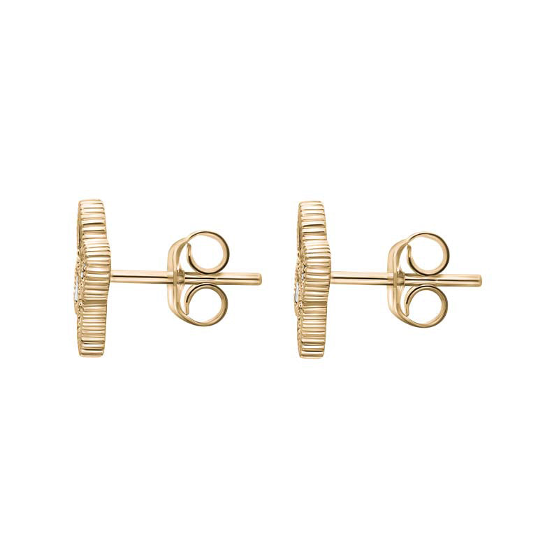 These elegant stud earrings features four stunning marquise shaped cabochons of the finest Mother of Pearl stone in the shape of a flower. The flowers are surrounded with a rope edge detail for a unique, stylish finish. The striking Mother of Pearl forms a stunning combination with the 9ct yellow gold, the perfect look for every occasion. Presented on post and butterfly fitments for secure wear.