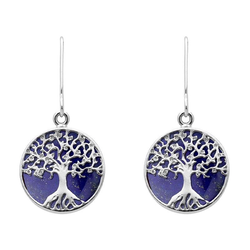 Sterling Silver Lapis Lazuli Round Tree of Life Drop Earrings