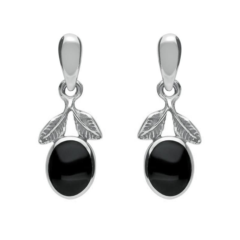 A small oval of hand carved original Whitby Jet is the centre piece of these drop earrings. Solidly backed and set in sterling silver, a small leaf decoration is either side of the top of the Jet piece, giving a natural, gentle appearance. Fastened with a secure post and butterfly fitting.