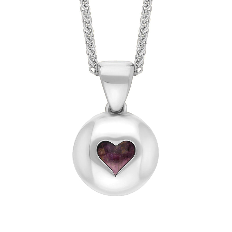 This on-trend 18ct white gold chain necklace features a petite disc encapsulating a fine Blue John stone that has been sourced locally from the heart of the Peak District, Castleton. Completed with a beautiful heart-shaped cutout to the back to show the back of the natural stone.