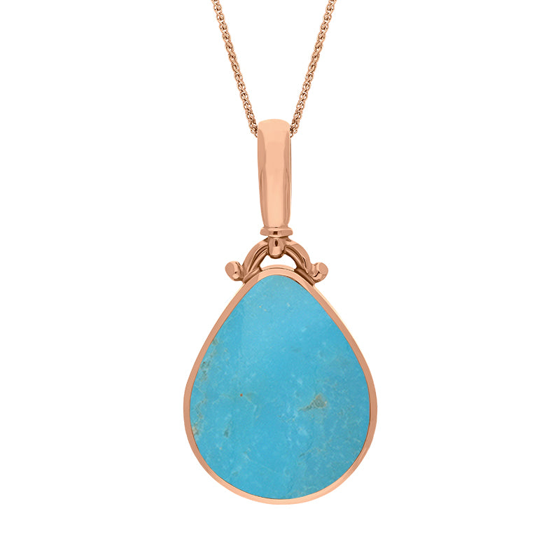 This classic double sided fob necklace is part of our Heritage handmade jewellery collection and features a pear shaped locally sourced Derbyshire Whitby Jet gemstone on one side and a blue lustrous Turquoise on the other, for the choice of two elegant looks. The stones are framed within a heavy highly polished 9ct rose gold setting with a loop scroll top bail. This item is supplied complete with an 18 inch rose gold chain.