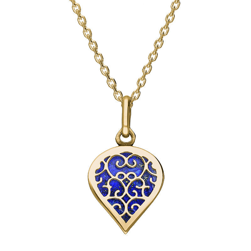 9ct Yellow Gold Lapis Lazuli Flore Filigree Small Heart Necklace. P3629.