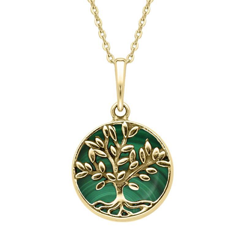 This 9ct yellow gold pendant features a gorgeous disc of Malachite set within a 9ct yellow gold frame, overlaid with a beautiful Tree of Life detail. An elegant and unusual piece of jewellery, perfect for nature lovers. The item also comes with an 18 inch 9ct yellow gold chain.