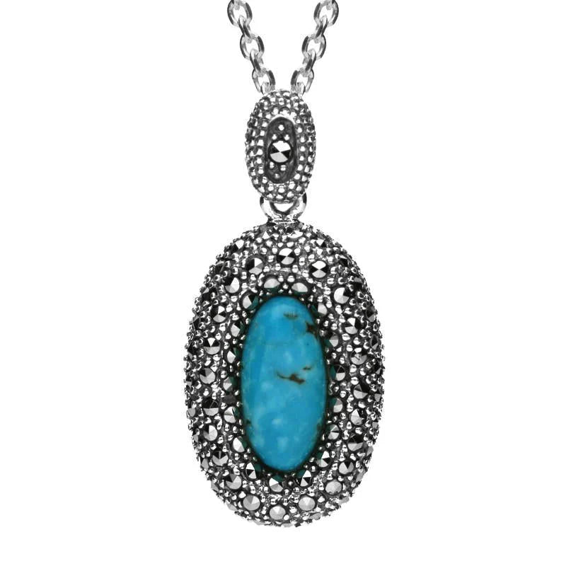 This elegant necklace features a striking oval shaped cabochon of Turquoise stone. The stone is set within a sterling silver oval pendant embellished by glistening marcasite stones, giving the piece a sparkly and sophisticated finish. The pendant hangs gracefully from a fluid 18 inch sterling silver chain completed by a classic bolt ring clasp for easy wear.