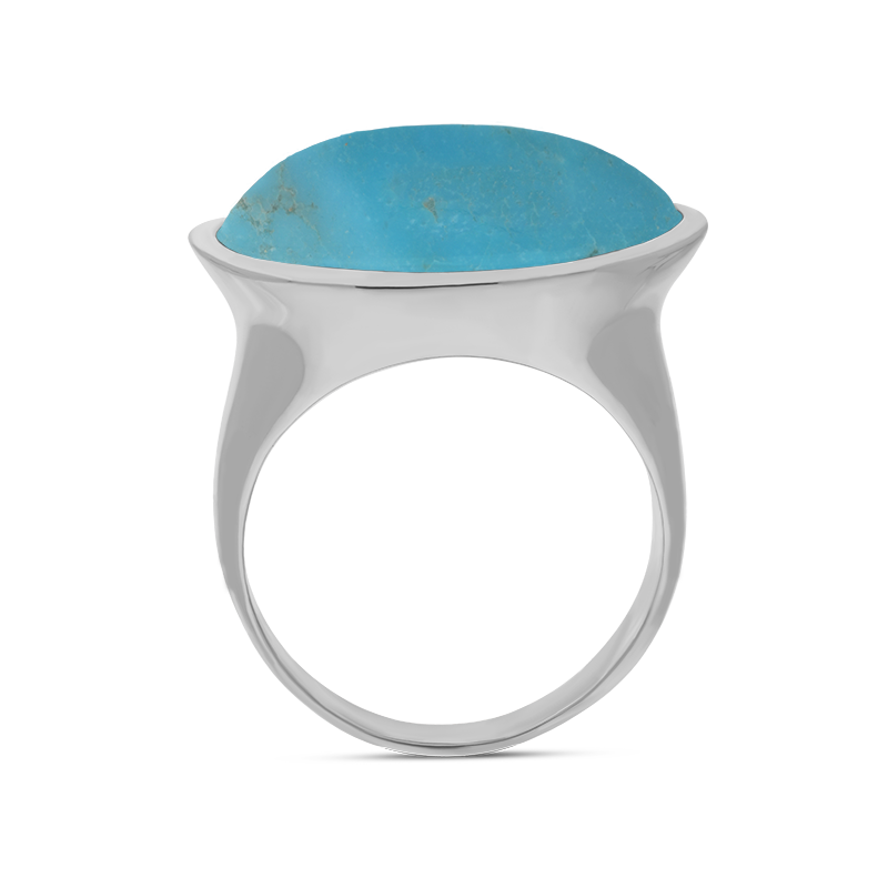 This elegant ring features a stunning oval cabochon of hand carved Turquoise which has been sourced directly from the famous Kingman mine in North Western Arizona. The gemstone is set within an exquisite sterling silver base and completed with a wide statement sterling silver band.