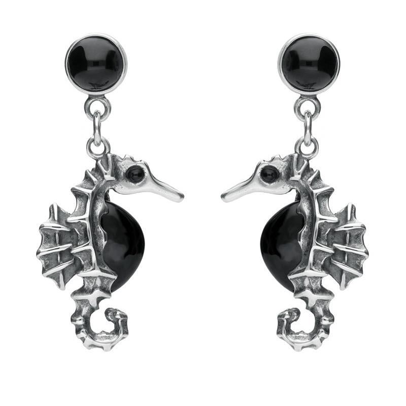 Sterling Silver Whitby Jet Seahorse Drop Earrings. E1780.