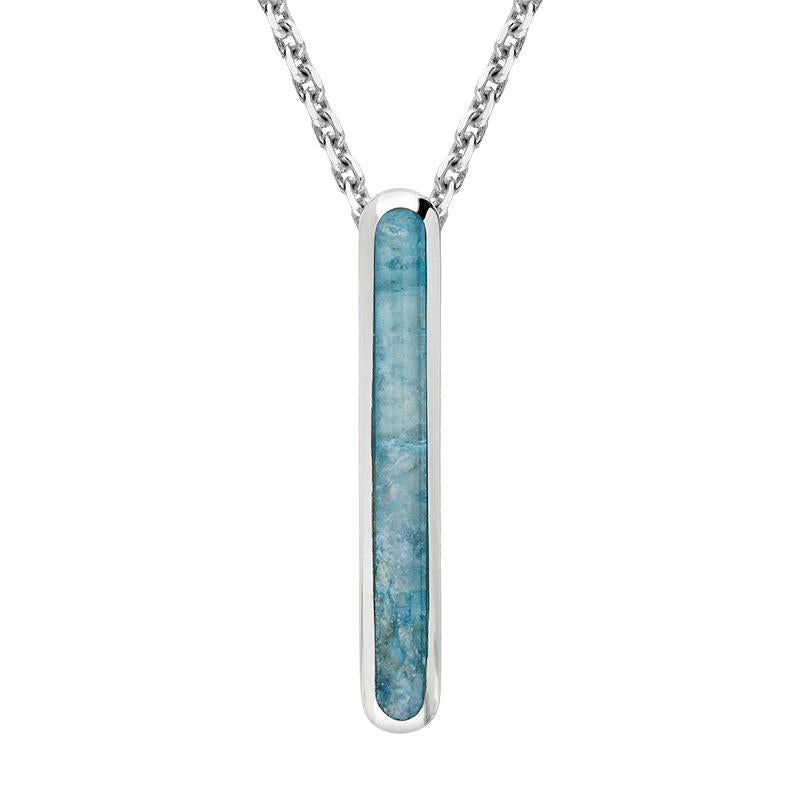 With minimalist design and a distinct architectural edge, this elegant drop pendant necklace features a 25mm long hand cut Aquamarine gemstone framed in a contemporary sterling silver setting. The pendant is presented on a fluid 18 inch long sterling silver chain, which has a lobster style clasp for easy opening and closing.