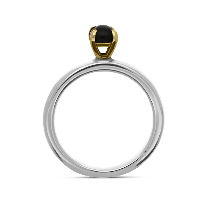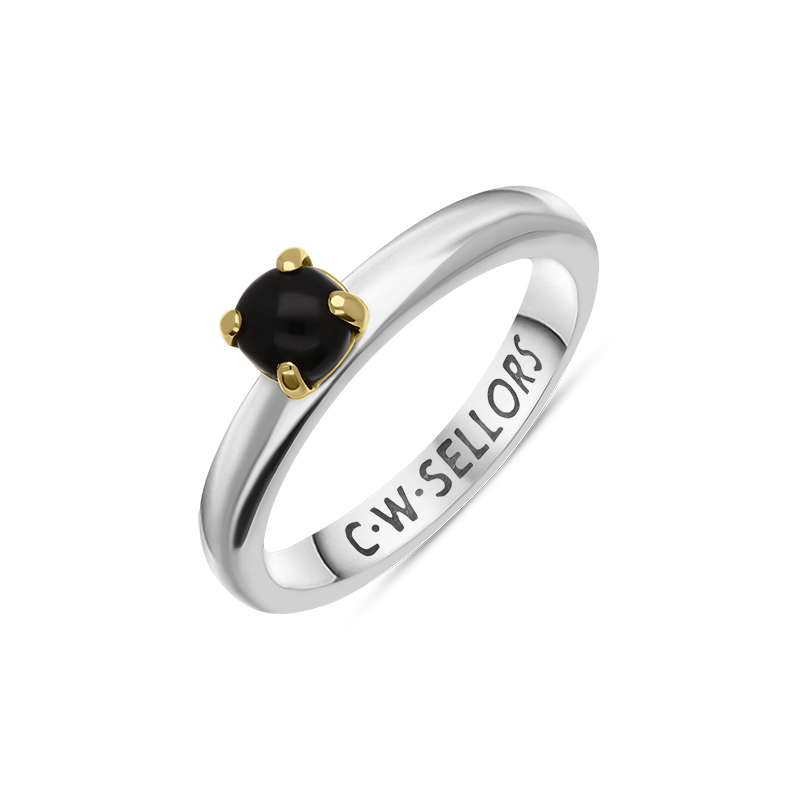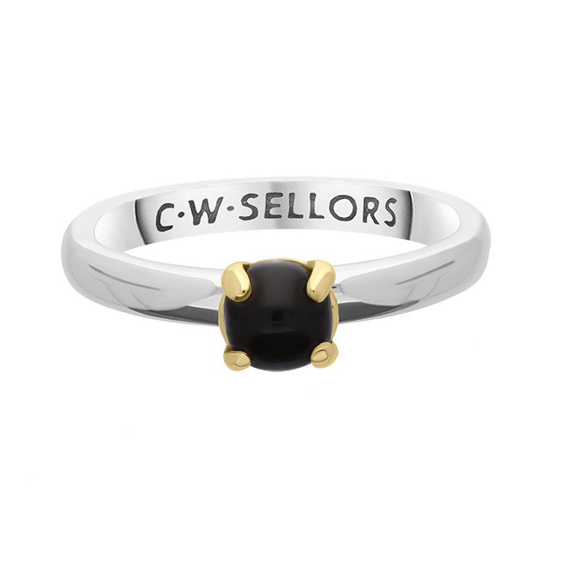 This ring features highly polished genuine Whitby Jet claw set in 9ct yellow gold on a sterling silver shank.