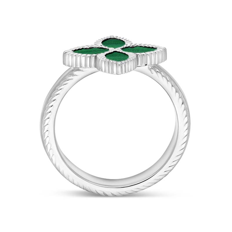 These elegant stud Ring features four stunning marquise shaped cabochons of the finest Malachite stone in the shape of a flower, sourced directly from the north east coast of Yorkshire. The flower is surrounded with a rope edge detail for a unique, stylish finish. The striking Malachite forms a stunning contrast between the sterling silver rope edge frame, creating the perfect look for every occasion. Presented on post and butterfly fitments for secure wear.