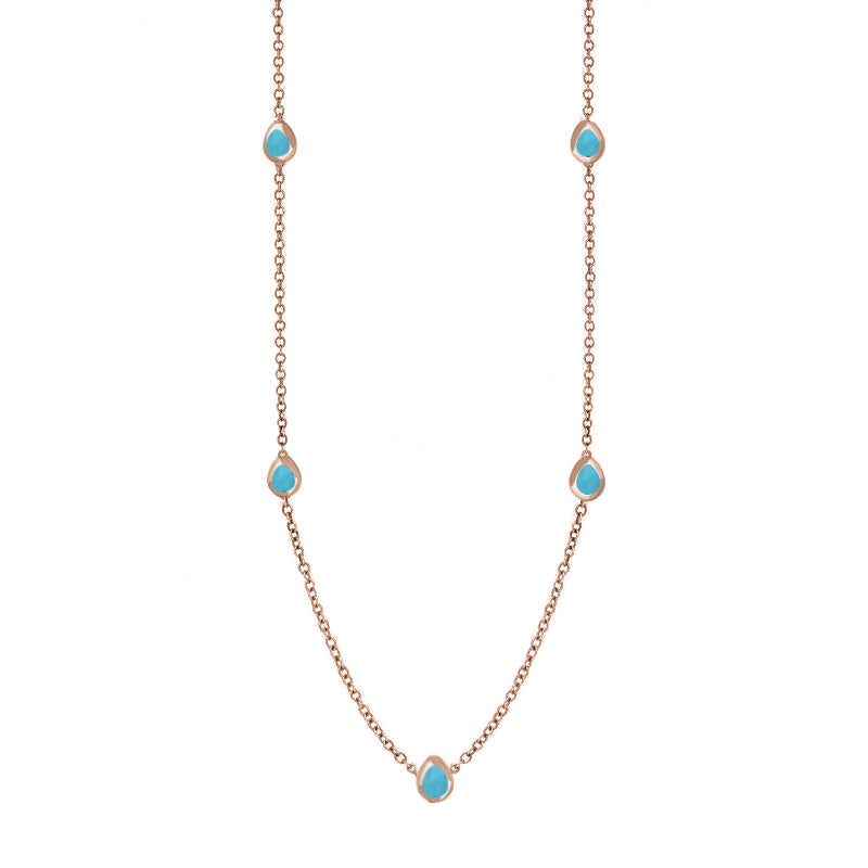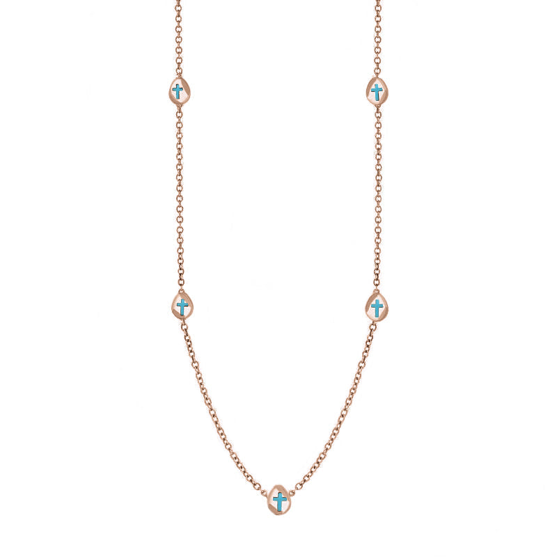 This on trend 18ct rose gold chain necklace features petite discs embellished with cross shaped fine Turquoise stones that have been sourced directly from the North East coast of Yorkshire.