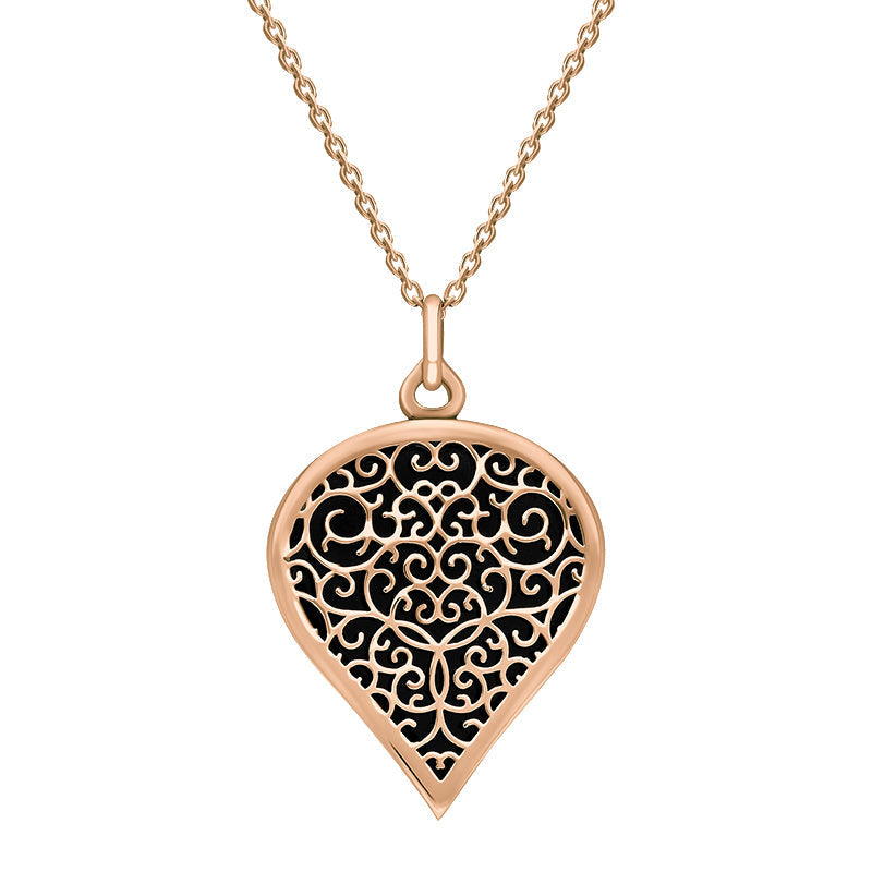 9ct Rose Gold Whitby Jet Flore Filigree Large Heart Necklace. P3631.