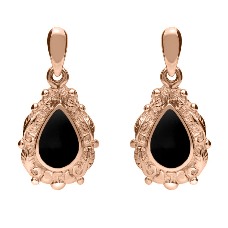 9ct Rose Gold Whitby Jet Pear Shaped Leaf Drop Earrings