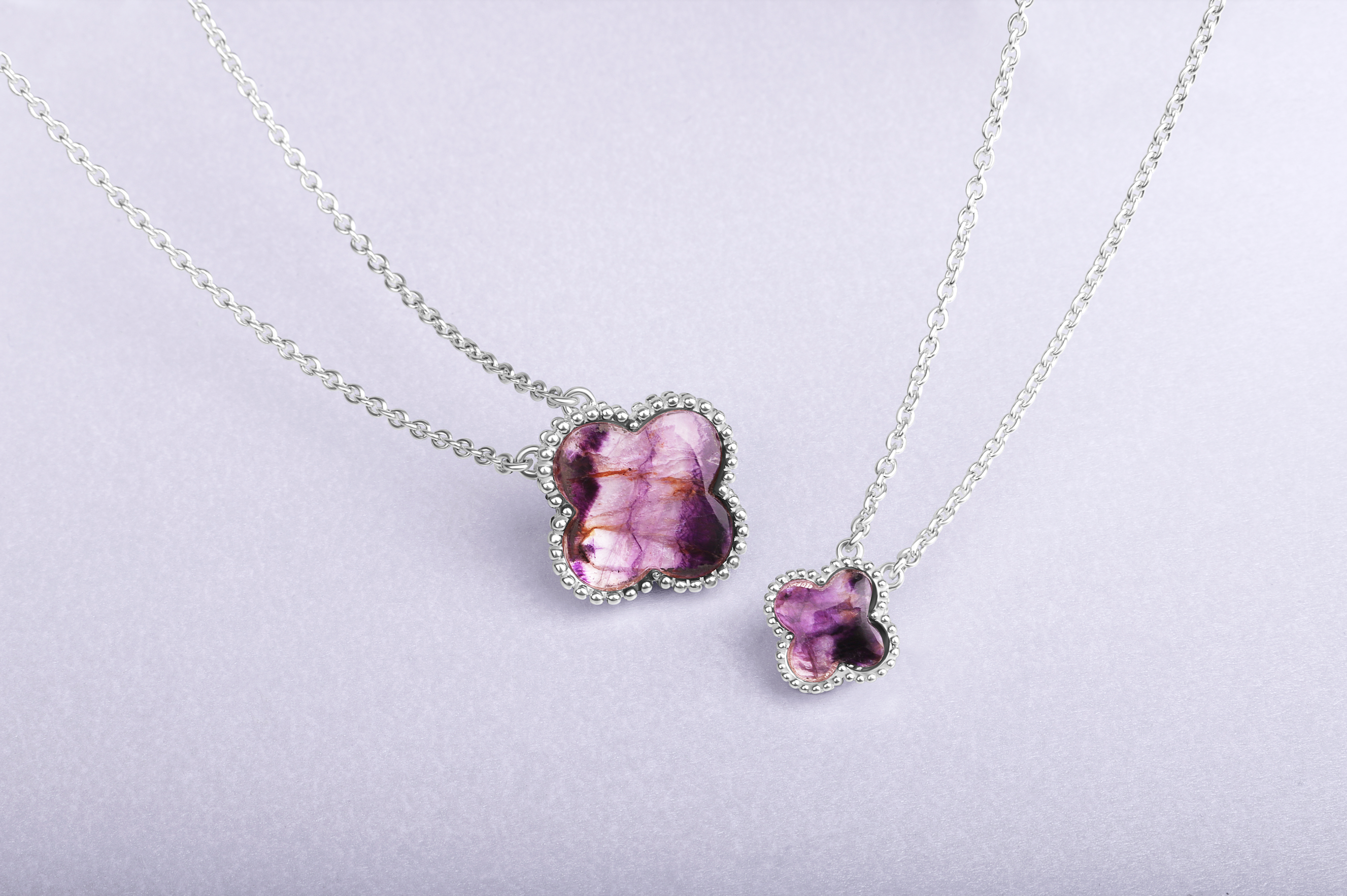 This elegant necklet features a stunning four leaf clover shaped cabochon of the finest Blue John stone, that has been sourced directly from the Derbyshire Blue John Cavern in Castleton. The clover is surrounded with ball detail for a unique, stylish finish. The striking Blue John forms a stunning contrast between the 18 inch sterling silver chain, creating the perfect look for every occasion.