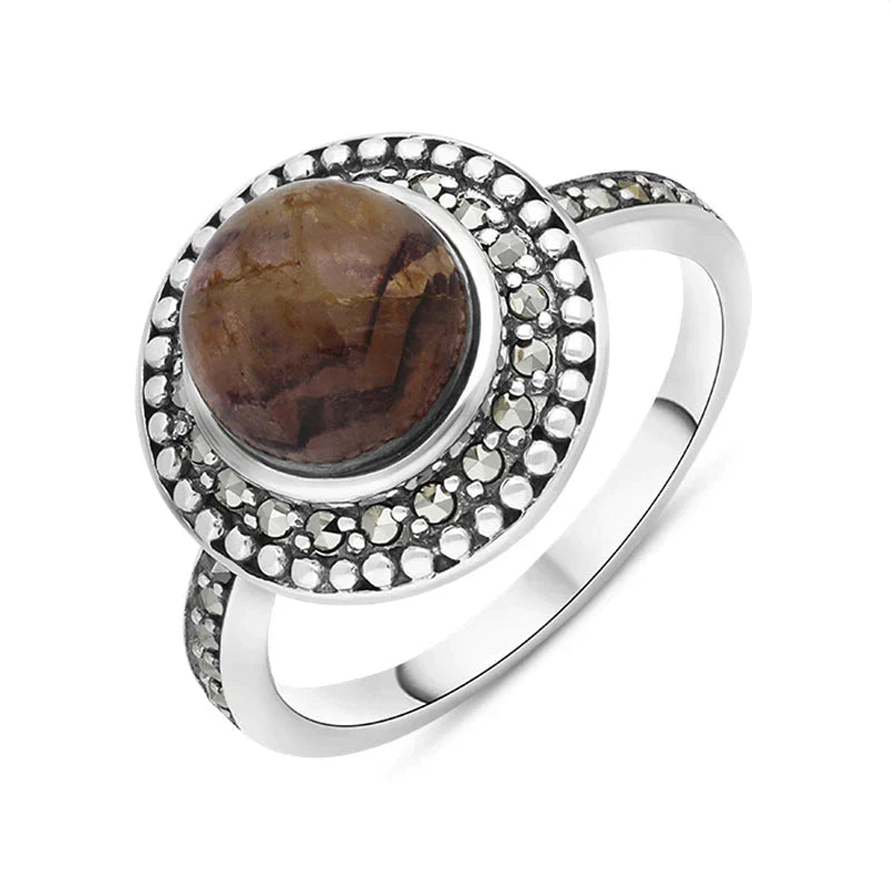 This statement ring features a large oval piece of hand carved Blue John, sourced directly from Castleton, Derbyshire. The stone is placed within an exquisite sterling silver round setting and has been embellished by dazzling marcasite stones, bringing a sophisticated sparkle to the piece. The detail on this ring continues onto the band to give an elegant finish.