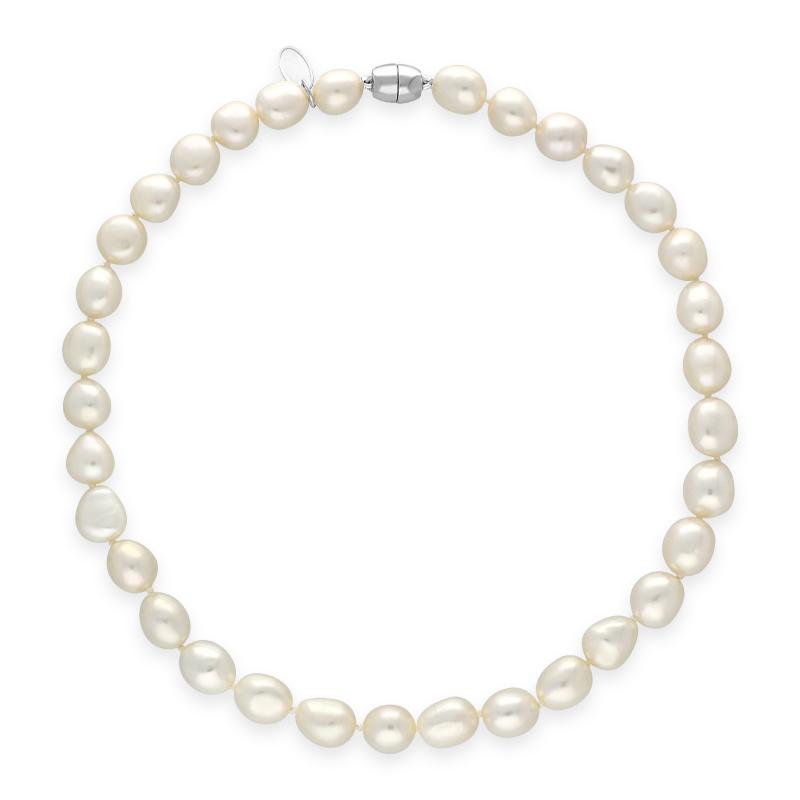 This stunning necklace features 10mm, baroque white pearls strung together with a barrel shaped sterling silver magnetic ball clasp, for ease and added security. A classic and beautiful addition to any jewellery collection, perfect for every day wear.