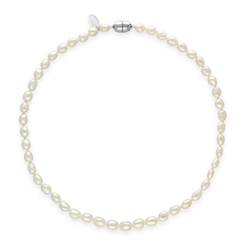 This stunning necklace features 6mm, baroque white pearls strung together with a barrel shaped sterling silver magnetic ball clasp, for ease and added security. A classic and beautiful addition to any jewellery collection, perfect for every day wear.