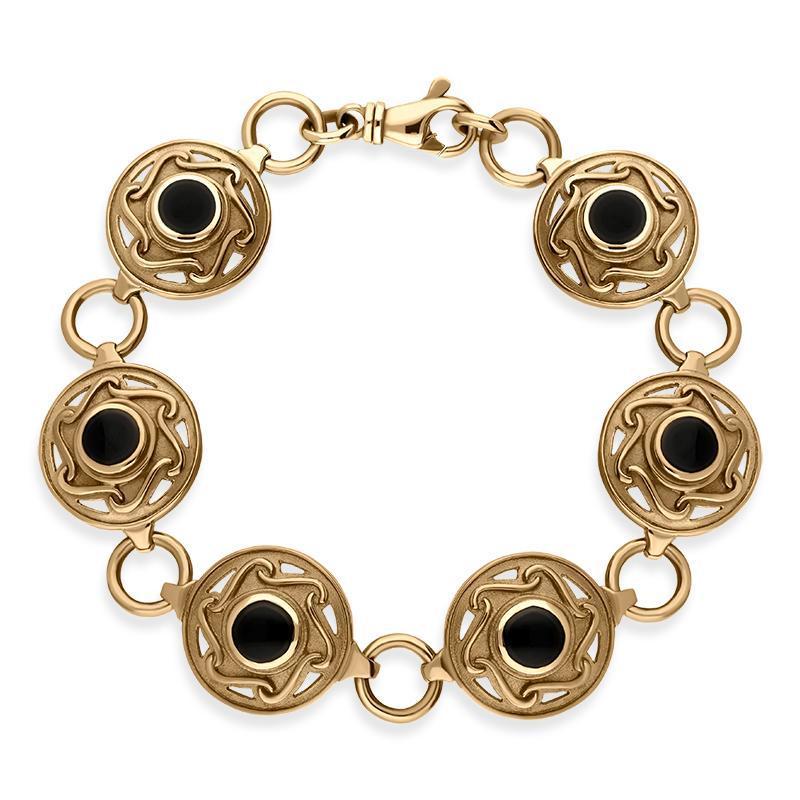 This traditional bracelet features 6 pieces of round cabochon, hand-carved original Whitby Jet gemstones, with each one polished to an immaculate shine. Each stone is surrounded by a wide Celtic style 9ct yellow gold open framework, linked together with neat and sturdy circular links. The bracelet fastens with a classic and secure lobster claw-catch.