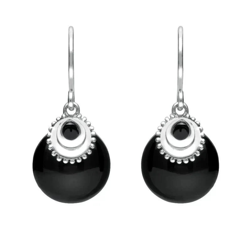 These feminine hook earrings feature stunning, highly polished Whitby Jet stone which has been sourced directly from the North East coast of Yorkshire. The earrings are embellished with patterned sterling silver cap detailing and completed with classic silver hook fittings. Perfect for any occasion.