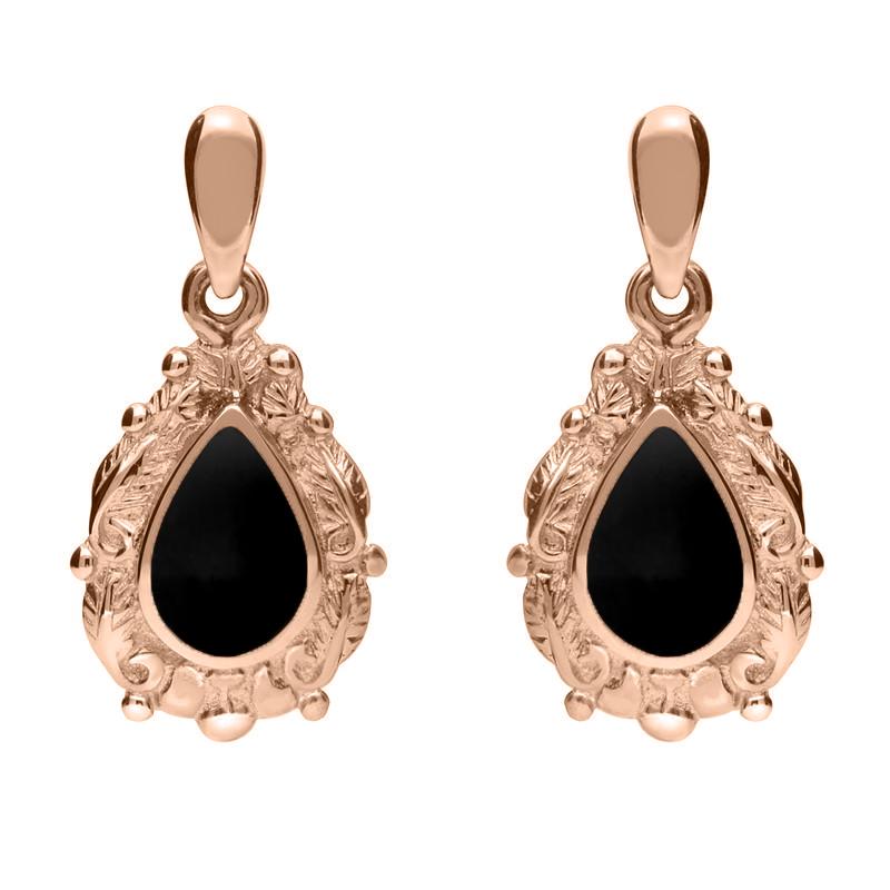 18ct Rose Gold Whitby Jet Pear Shaped Leaf Drop Earrings, E083.