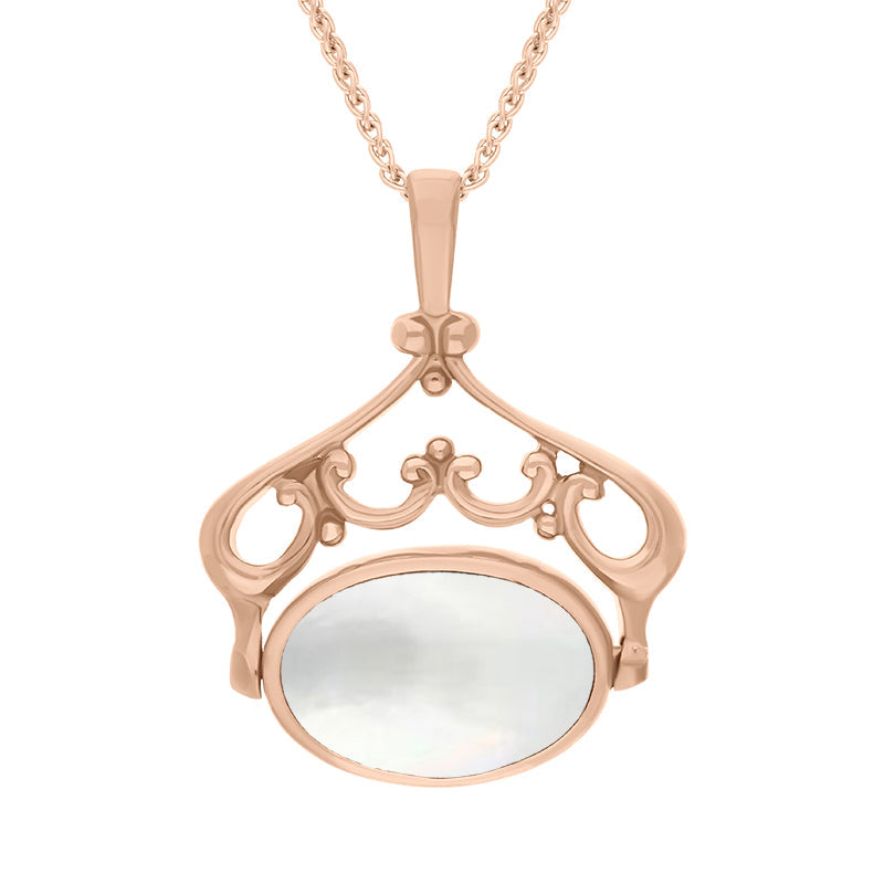 9ct Rose Gold Whitby Jet Mother Of Pearl Ornate Double Sided Oval Swivel Fob Necklace, P116_8.