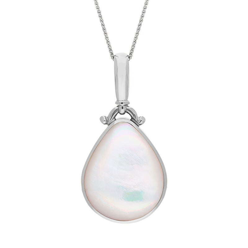 This classic double sided fob necklace is part of our Heritage handmade jewellery collection and features a pear shaped locally sourced Derbyshire Whitby Jet gemstone on one side and a white lustrous Mother of Pearl on the other, for the choice of two elegant looks. The stones are framed within a heavy highly polished 9ct white gold setting with a loop scroll top bail. This item is supplied complete with an 18 inch white gold chain.