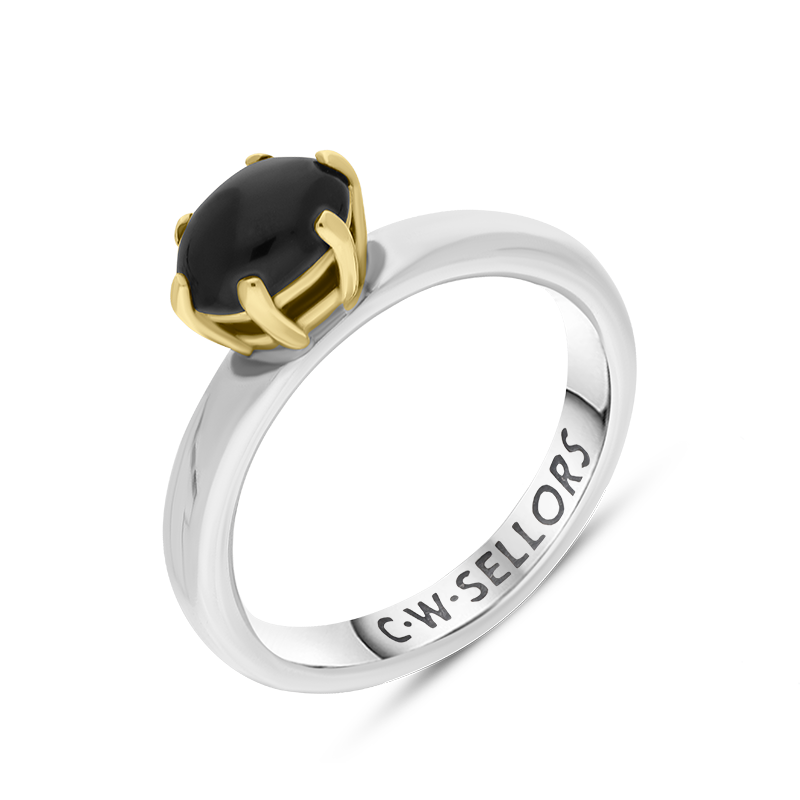 This ring features highly polished genuine Whitby Jet claw set in 9ct yellow gold on a sterling silver shank.